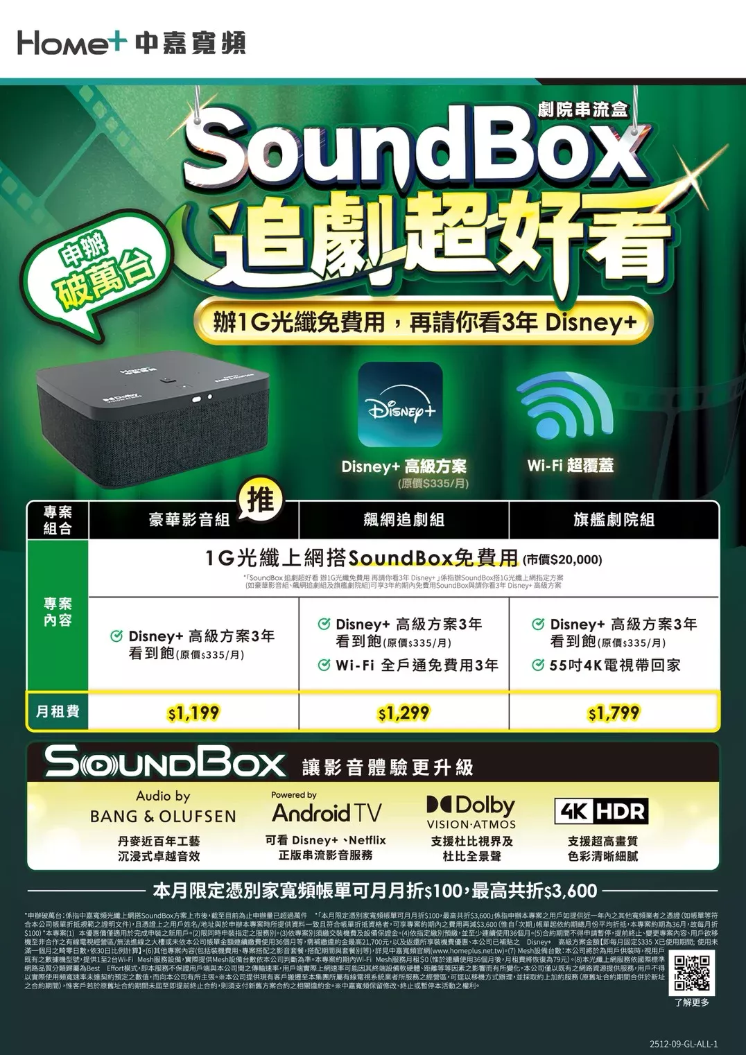 中嘉寬頻|麗冠 推出 SoundBox 劇院串流盒,辦1G光纖免費用,再請你看3年 Disney+!市價 $20,000 的 SoundBox 搭配指定1G光纖上網方案,限時免費帶回家,搭配 Disney+ 高級方案(原價$335/月)3年看到飽,讓你在家就能享受頂級劇院般的影音體驗。
