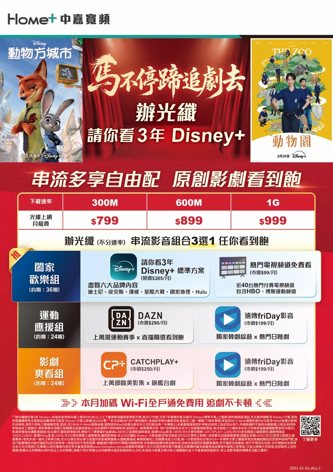 中嘉寬頻|麗冠 馬不停蹄追劇去!申辦光纖上網,即享3年 Disney+ 標準方案(原價$285/月)免費看到飽,還能從三大串流影音組合中自由挑選,不論是追迪士尼經典、看運動賽事直播還是追歐美影集,通通滿足你的影音需求。